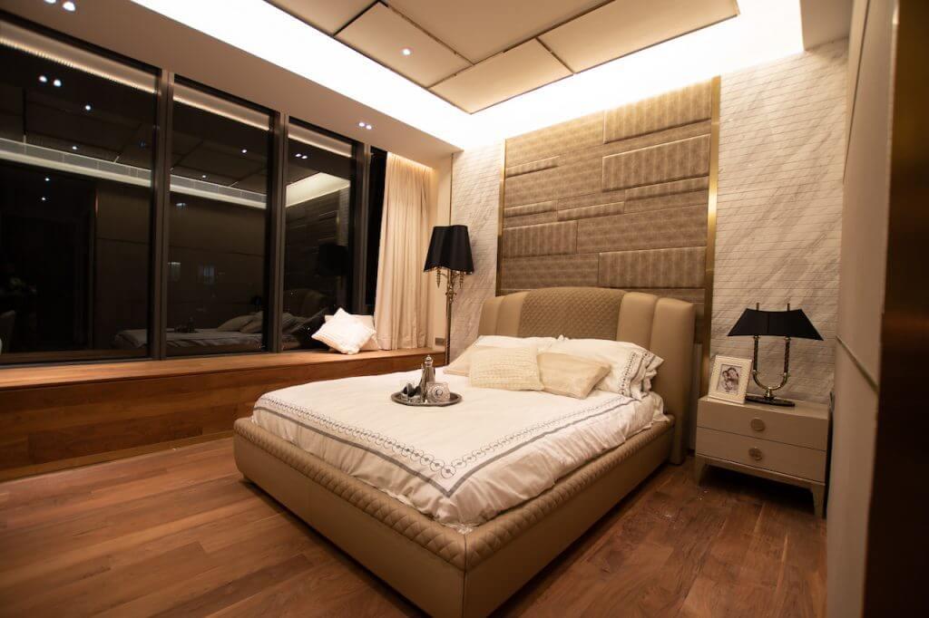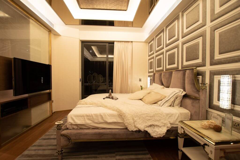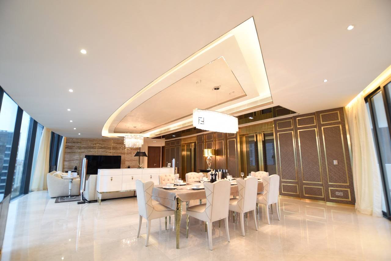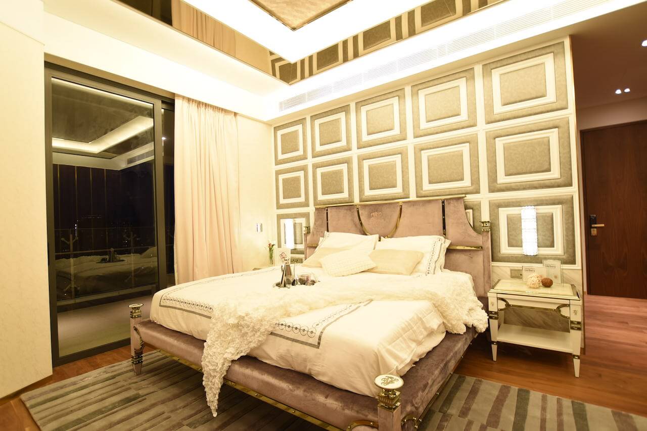 Using precious materials to infuse the connotation level of luxury style, so that the space with golden light shows elegant charm. Although the curved dining room is wide, it is also difficult to balance the furniture. Eric cleverly built a stepped finish behind the TV wall to create the illusion of straightening the wall to balance the overall feeling. The dining room is placed with a shaped dining table, so that the space is filled with a classical atmosphere. The master bedroom uses a characteristic wall with leather and floral lines to create a visual focus, while the timber wall on the other side uses champagne gold steel bars to enhance the elegance. Eric deliberately used uneven texture in the bathroom, giving people a sense of returning to nature.