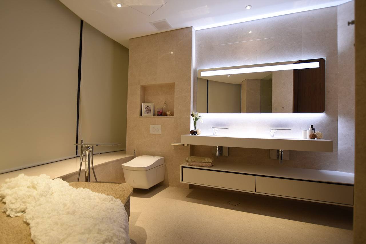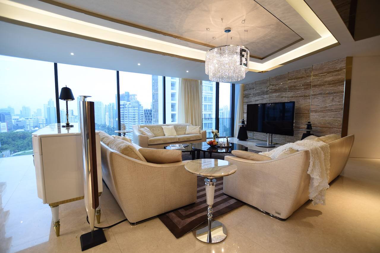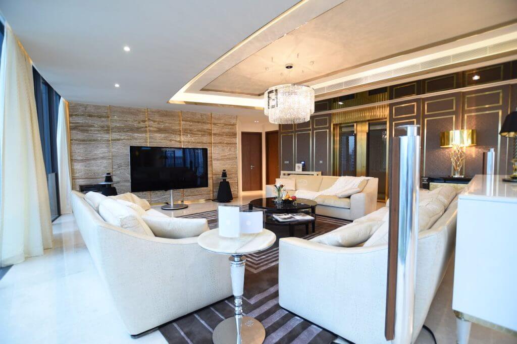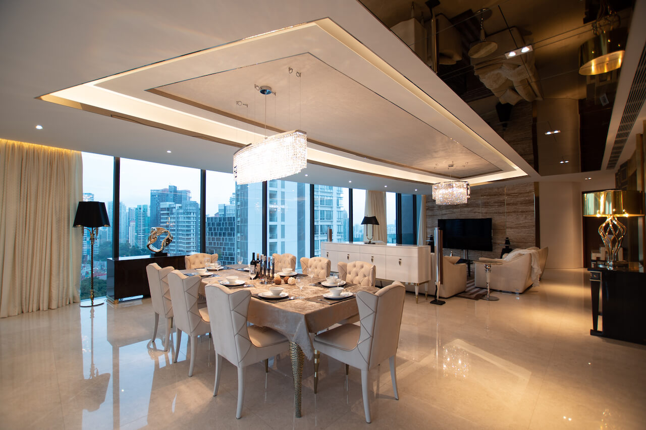 Using precious materials to infuse the connotation level of luxury style, so that the space with golden light shows elegant charm. Although the curved dining room is wide, it is also difficult to balance the furniture. Eric cleverly built a stepped finish behind the TV wall to create the illusion of straightening the wall to balance the overall feeling. The dining room is placed with a shaped dining table, so that the space is filled with a classical atmosphere. The master bedroom uses a characteristic wall with leather and floral lines to create a visual focus, while the timber wall on the other side uses champagne gold steel bars to enhance the elegance. Eric deliberately used uneven texture in the bathroom, giving people a sense of returning to nature.