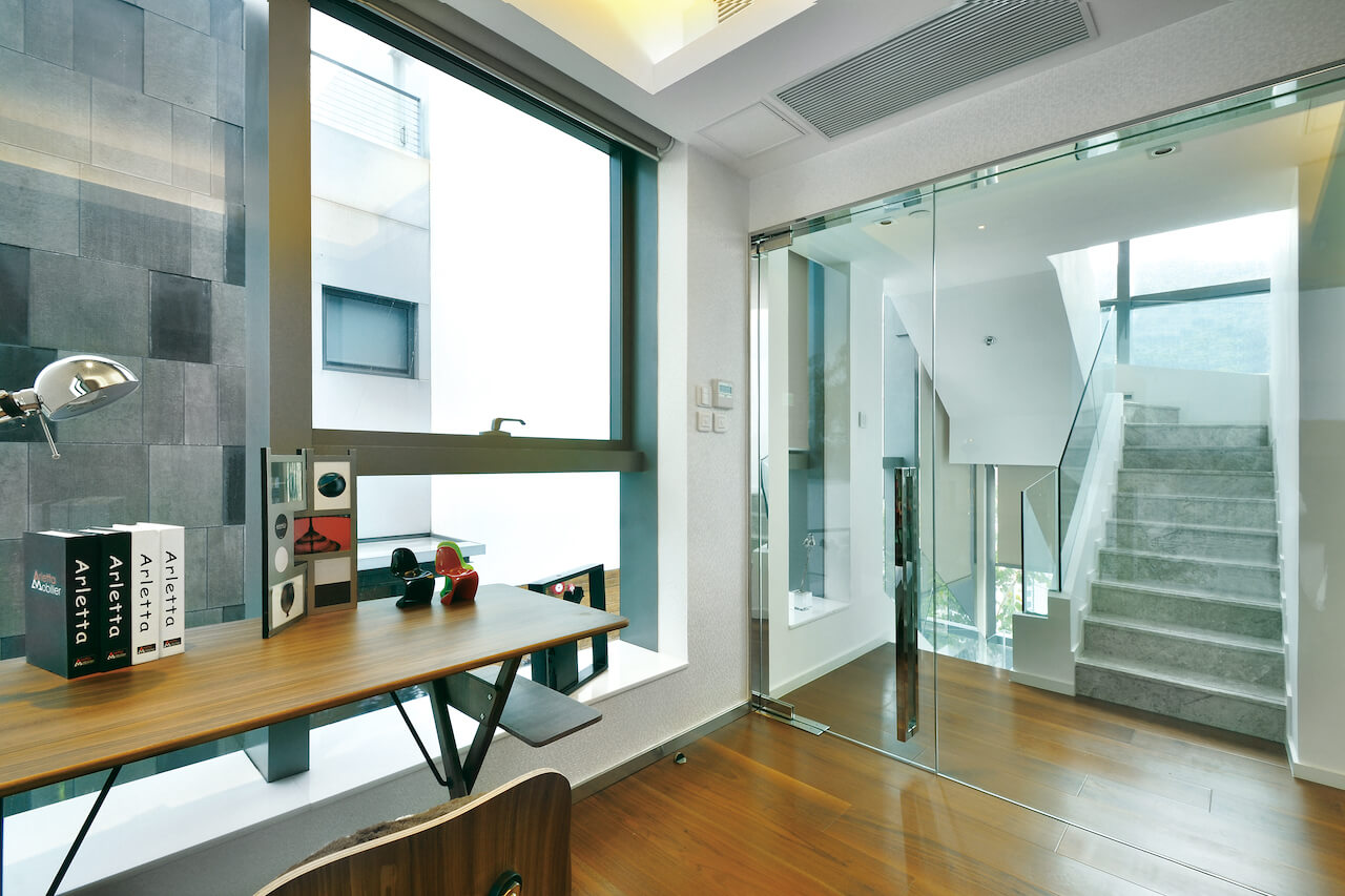 Nestled among neighboring white houses, this stylish single unit home featuring generous glass walls is an eye catching attraction. The floor-to- ceiling glass windows are made from high quality pellucid material to divide yet connect the interior with the open and scenic landscape. To maximize natural illumination and allow a panoramic view of the natural surroundings, designer Eric Fung appointed the home with impeccable decorative accessories and handpicked furniture. Beige forms the basis for theneutral colour scheme of beige enhanced by the surrounding nature; low furniture groupings allow for unrestricted observation of the exterior which blends in seamlessly with the interior design. Spaces are clearly defined by separating the living/dining areas from bedrooms located on different floors for privacy. The ground floor where the open kitchen and dining room are located exudes a sophisticated flair that echoes the garden vista outside the window facade. Walls are lined with silver mosaic tiles while light grey marble flooring and translucent Louis Ghost chairs by renowned designer Philippe Starck add sparkle to the heart of the home.