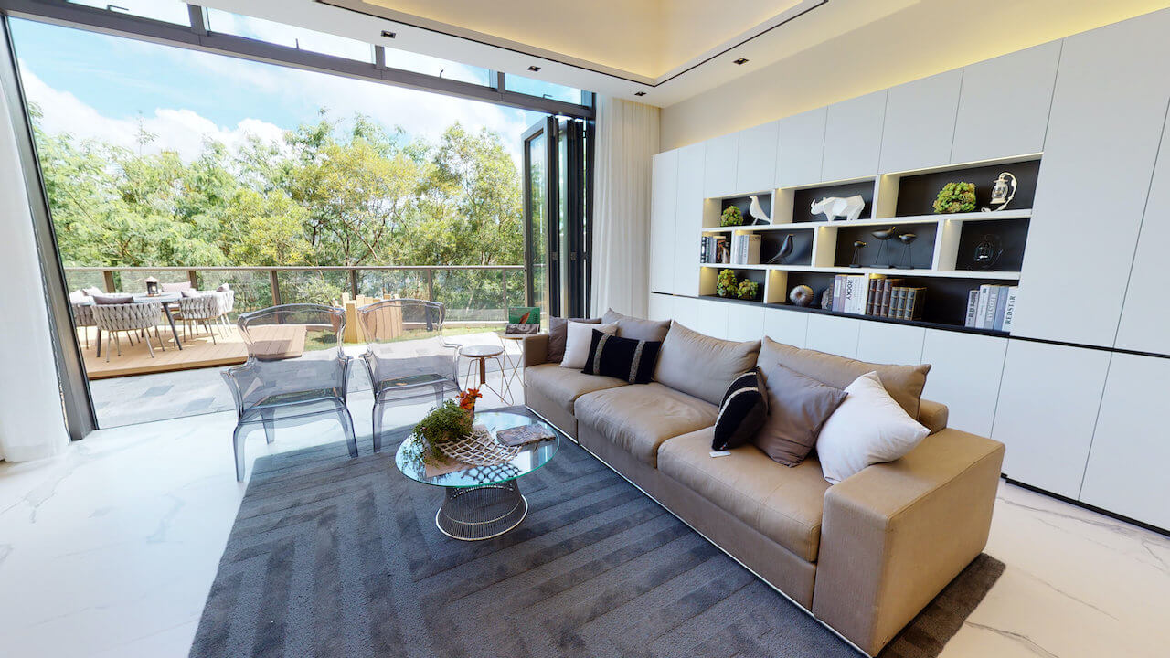 The project is located in the superior location of the traditional mansion in Cove Hill. The overall style is mainly simple, but full of fashion with a lot of white space and a small amount of black accents. The large floor-to-ceiling windows leading to the terrace and the white wall make the living room bright and bright, and the scenery is panoramic, away from the bustle of the city. The floor and TV wall are made of Italian marble nano-tiles with intricate patterns, which form a strong contrast with the darker dining tables, wall cabinets and other furniture, setting a comfortable and unique atmosphere for the entire space. The tall Buddhist Pine in the garden is a highlight, which incorporates a little Chinese element into the simple Western style house. The cabinet door and floor of the master bedroom are made of matte lacquer and different wood grains to complement each other, which is low profile and full of texture. The overall style of the bedroom uses warm colors to match, with light-colored wood grain, adding an elegant feeling.