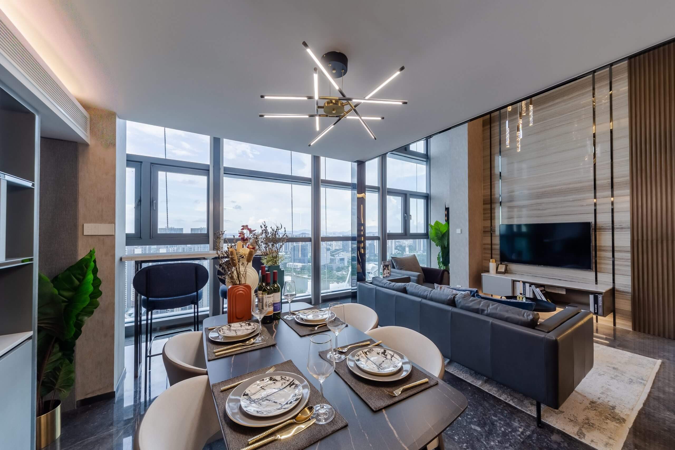 Entering the living room, what you see is a large piece of marble spread on the TV wall, matched with the calm wood, and embellished with steel branches, in contrast to the dark gray marble floor. In order to add a sense of hierarchy to the space, the large-scale furnishings in the house include sofas, coffee tables, dining tables, etc., all in shades, coffee, and tea. The characteristic pendant lamps with geometric lines are hung on the mezzanine ceiling, which is simple and stylish.