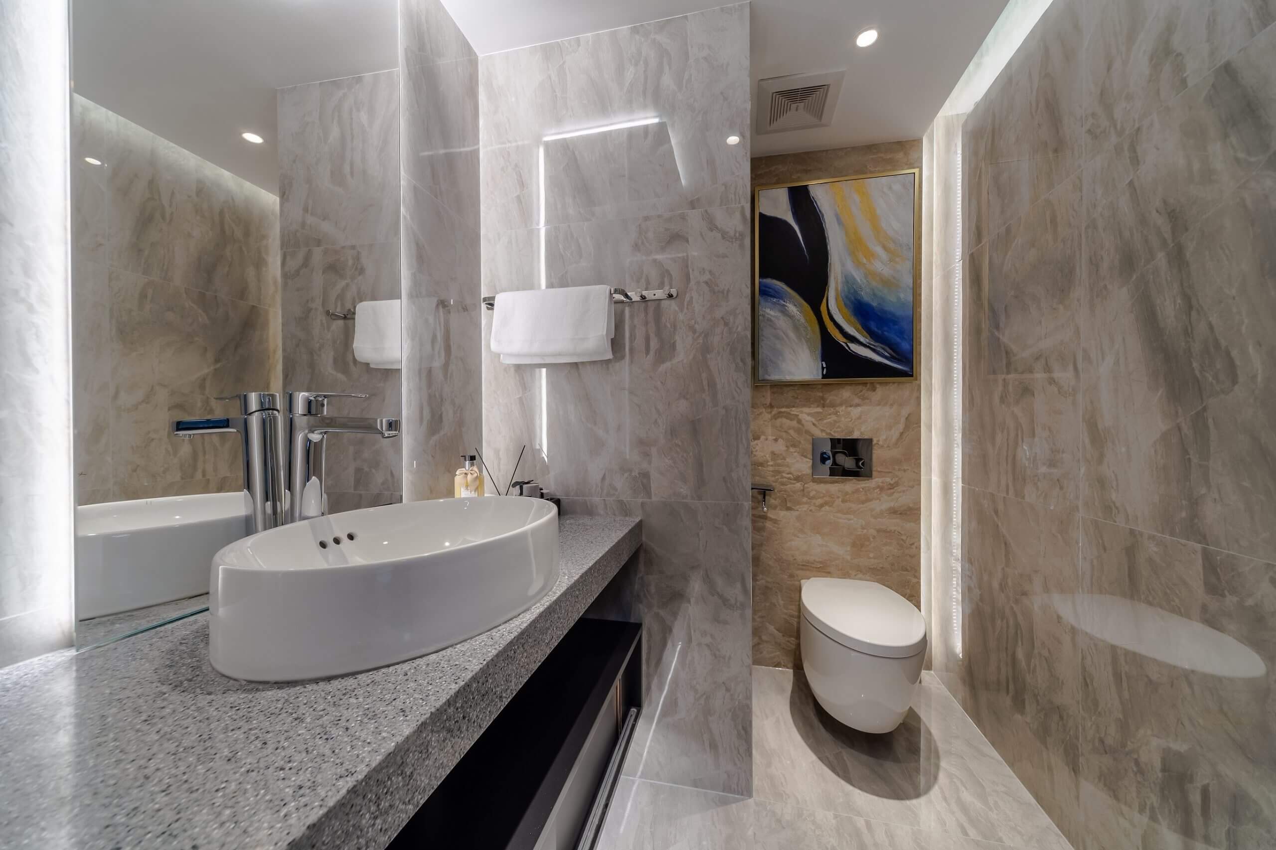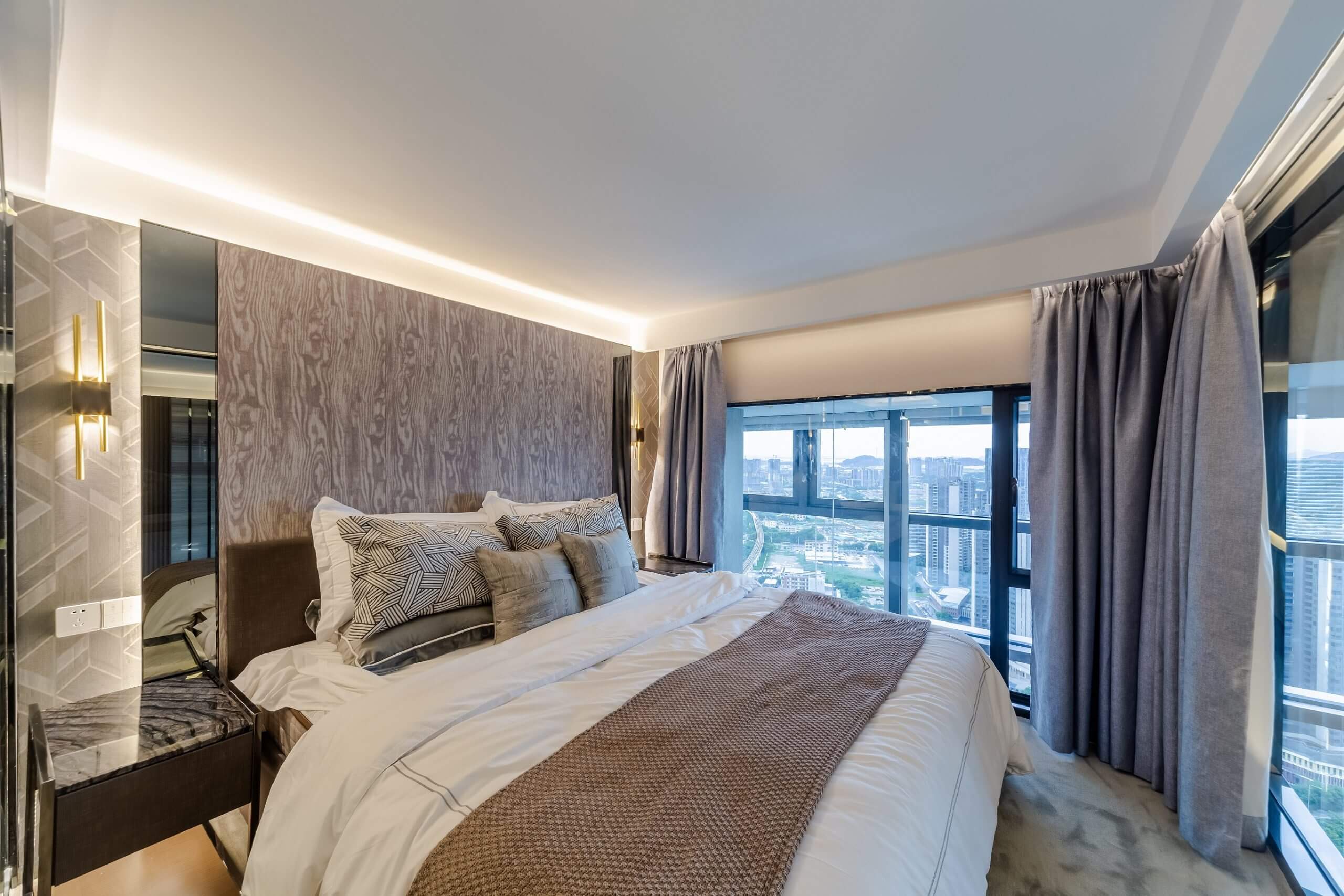 The master bedroom on the upper floor is dominated by earth colors, and the headboard uses wallpaper with different textures to create a characteristic wall, creating a simple and modern feeling. The floor is covered with light gray carpet. In order to create the greatest sense of space in the limited space, the designer uses the glass wall as the bathroom partition, which allows light and sight to penetrate each other. The black frame design on the glass wall and door echoes the design feeling of the lower level. consistency.
