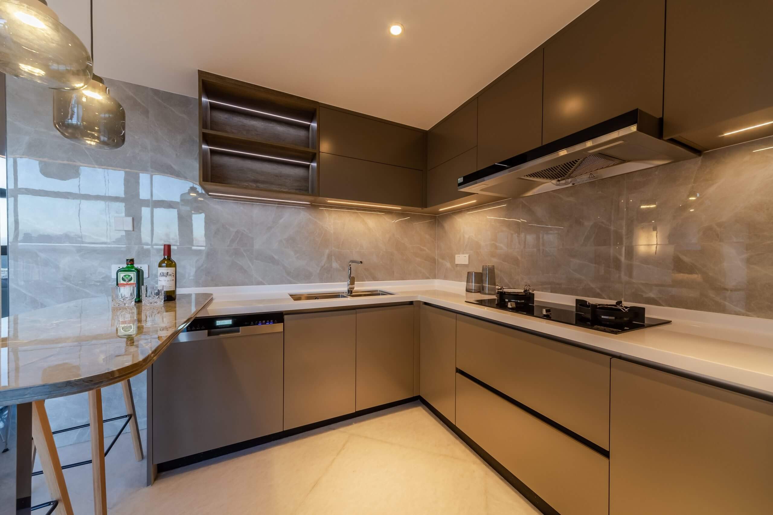 The kitchen contrasts with different shades of gray, and the extremely concise cabinet shape accommodates all the trivialities of life, which is quiet and concise. The open space makes the originally small kitchen spacious and bright, with pure colors, artistic light sources, and clean lines, and the kitchen space can also be exquisite.