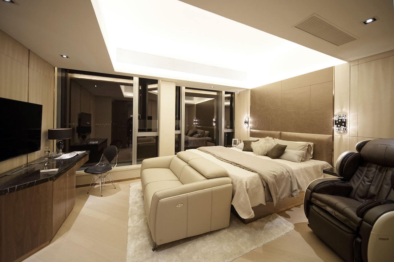 The whole house is dominated by the earth tone, and the walnut strips are used as decorative features, which are infused with the elements of nature, and a steady and elegant taste, which is well-matched with the deep interest of the owner’s collection. The walls of the master’s bedroom are arranged in brown suede, in which the back wall of the bed is centered in dark brown suede, decorated with gold borders on both sides; each side is decorated with light brown suede with two wall lamps, hotel-like.