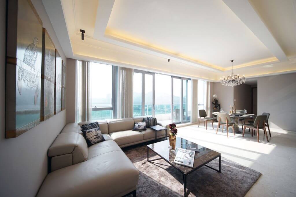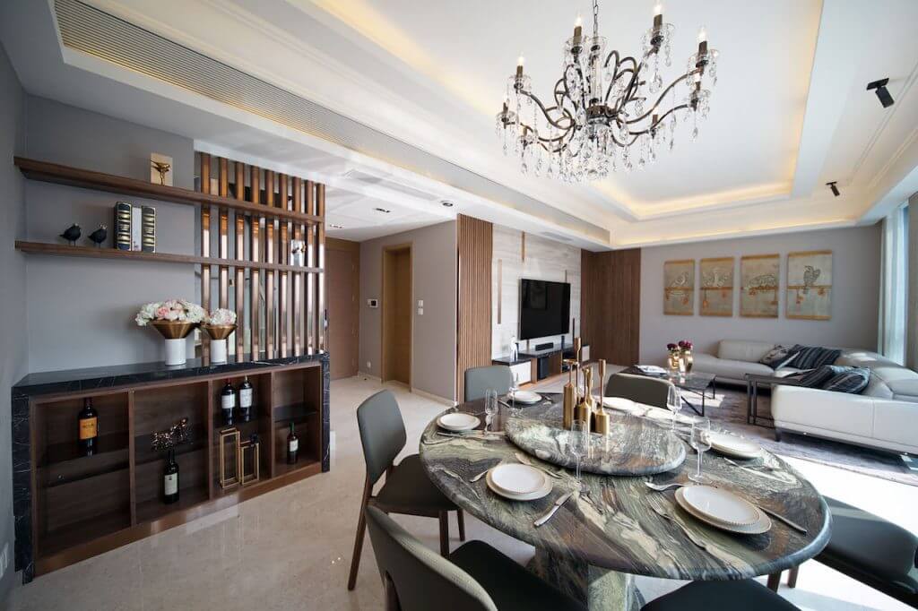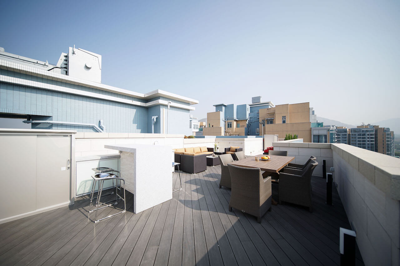 The unit has a rooftop, and the terrace is covered with outdoor wood. In addition to the outdoor sofa and dining set, Eric also has a bar for the family, at the same time potted some flower plants to add a natural feeling. Imagine having barbecue here in holidays!