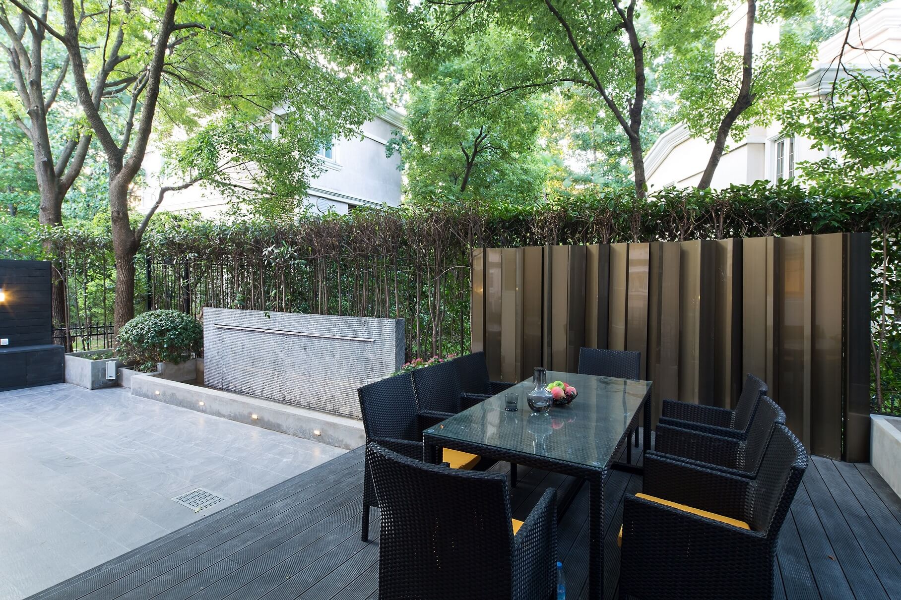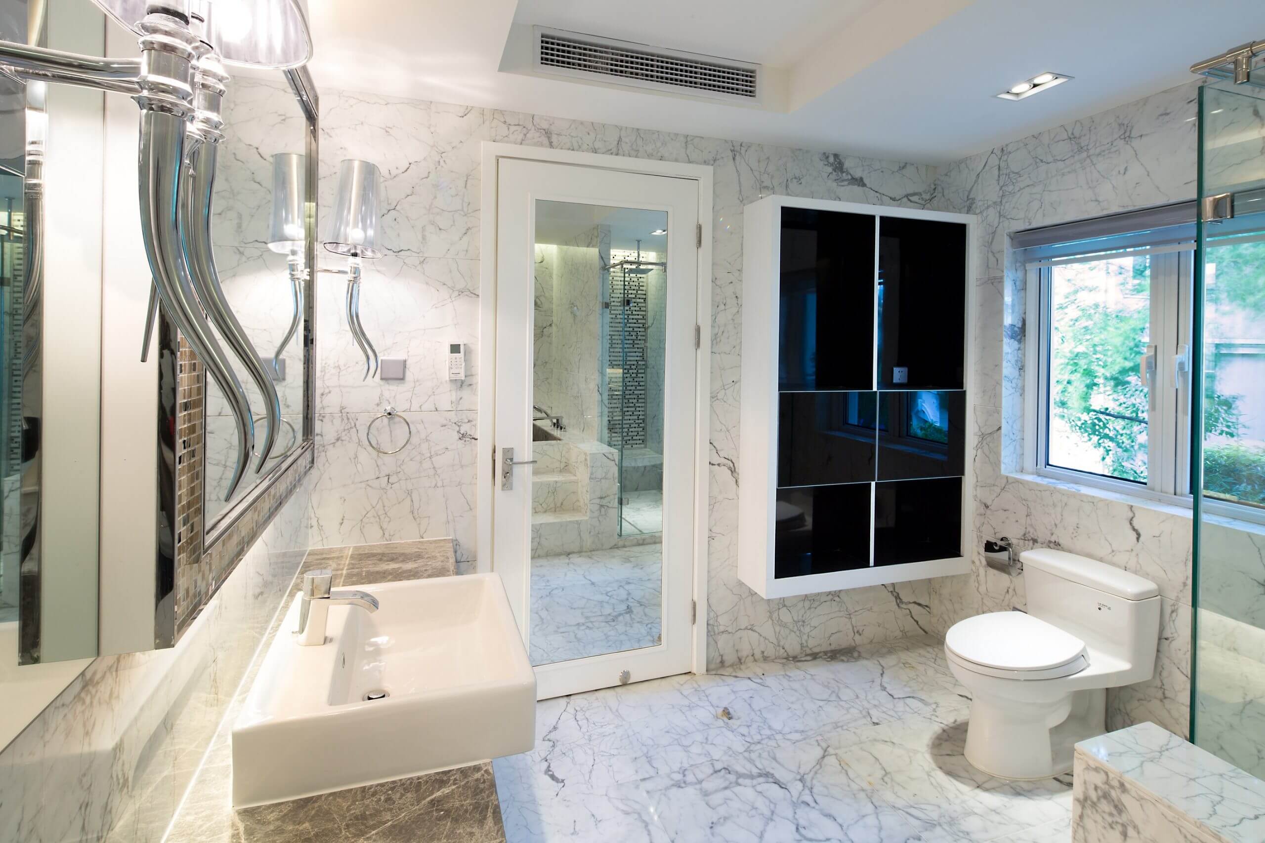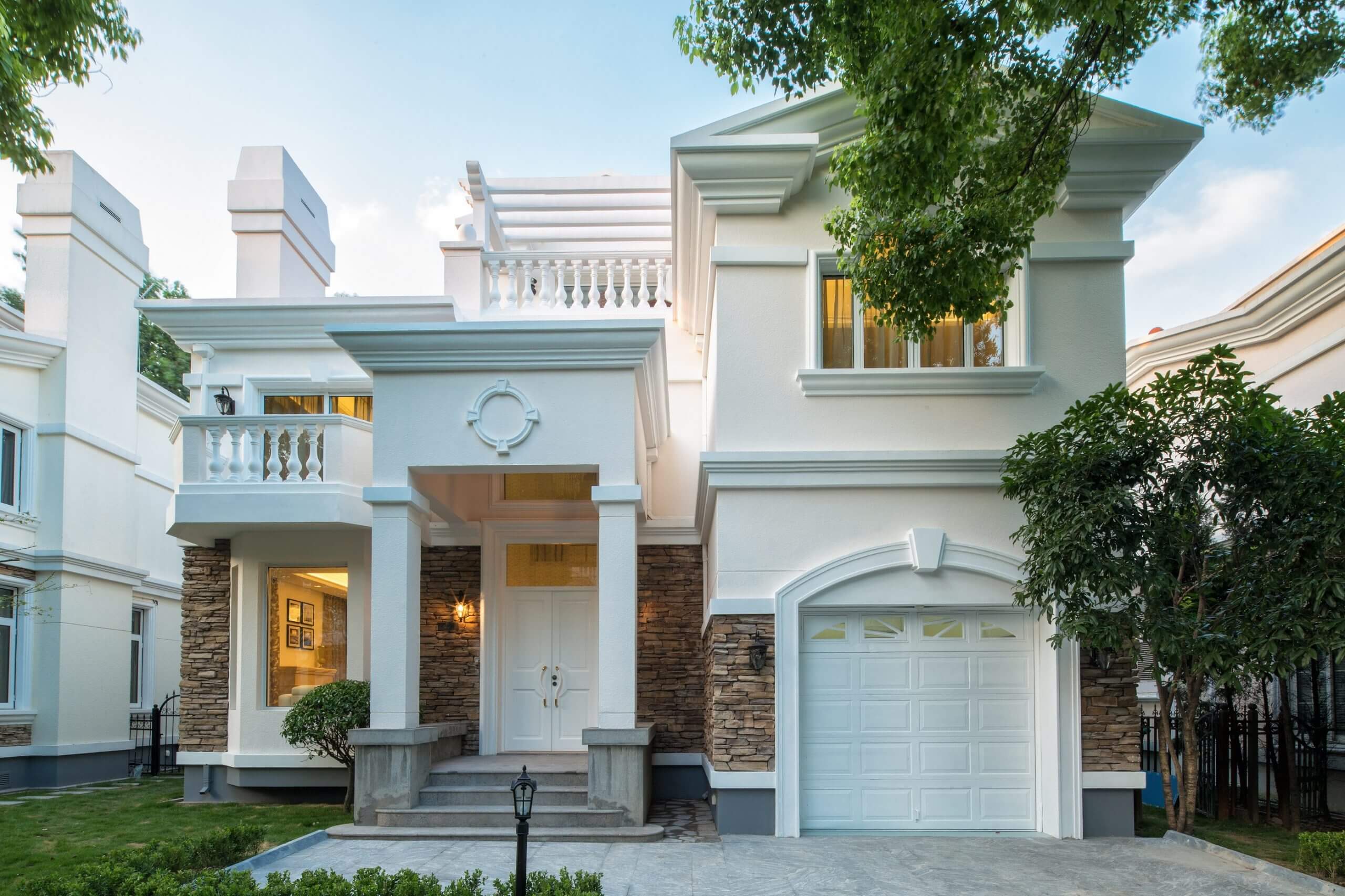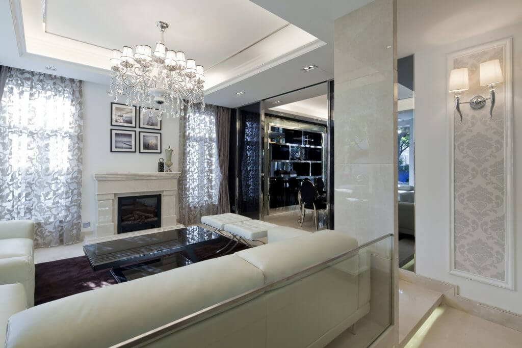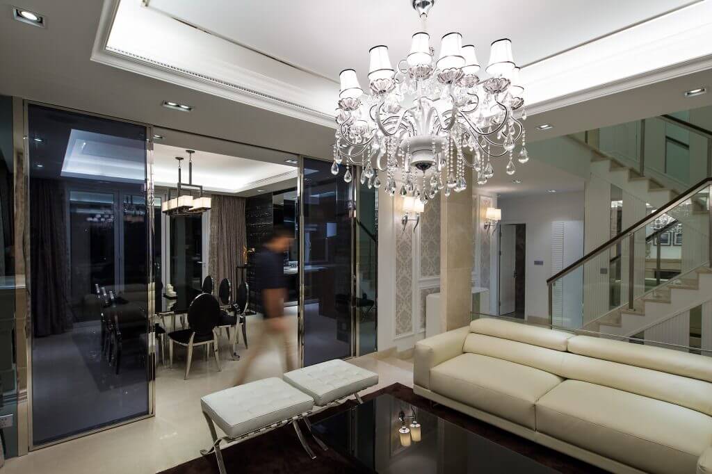 獨立屋外形恍如歐洲宮廷,腦海中不禁浮現奢華的歐陸裝潢,雕琢浮誇的花線遍佈居室,冠冕堂皇,氣派十足,但卻非屋主的夢想居停。大宅摒棄使用累贅的縷花圖案,適量糅合歐陸風格的設計精粹,打造瑰麗柔逸的空間格調。透過一幅幅飄揚雅緻的暗花紗簾,光線恰量地滲進屋內,別墅地面為客飯廳,兩組方框形的假天花清晰區分兩區,花線筆直有序,焦點落在兩盞歐陸風格的吊燈上,客廳牆壁裝置仿爐框配電暖爐,時尚的裝飾元素勾勒簡約的歐陸風;兩道夾絲玻璃配鏡框的趟門,通往以黑玻璃配鏡鋼。