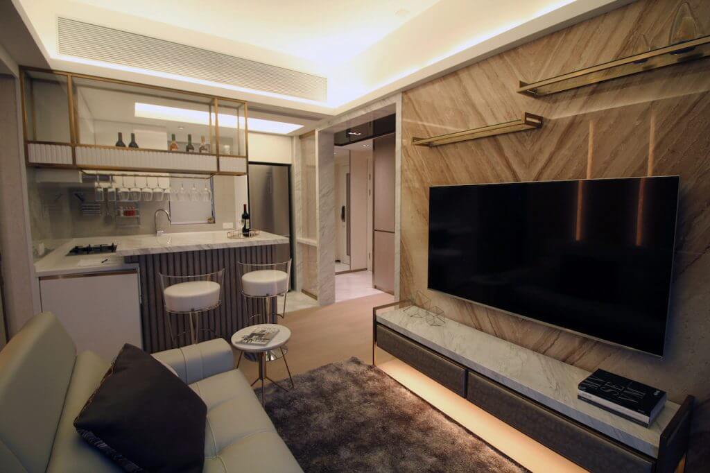 The foyer is paved with white-grey marble, the wall is set with large mirrors, and the ceiling is also set with a gray mirror. The visual space of the entrance is doubled, and the wall is decorated with a characteristic glass with a gold thread in the middle. There is a marble arch in the entrance of the living room. Since then, there has been a grandeur of the Millennium Mansion. The houseowner does not cook very often. In addition to the basic equipment, the kitchen also has a bar on the border. At the same time, the width of the kitchen can also be used as a dining table; it is compatible with the role of the dining room. There is a gold-steel frame glass hanger on the bar, which can be used to hang upside down glass wine glasses, as the lounge bar. Another desire of the female owner is that the bathroom has both a bathtub and a shower. If it is the original layout of the apartment, it is undoubtedly a luxury. However, after the two rooms were constructed into one, the designer is allowed to use part of the space in the bedroom to add a bathtub in the toilet, the shower room was also preserved. A glass is placed between the bathtub and the bedroom, allowing the owner to enjoy the outdoor view and the wall-mounted TV at the end of the bed.
