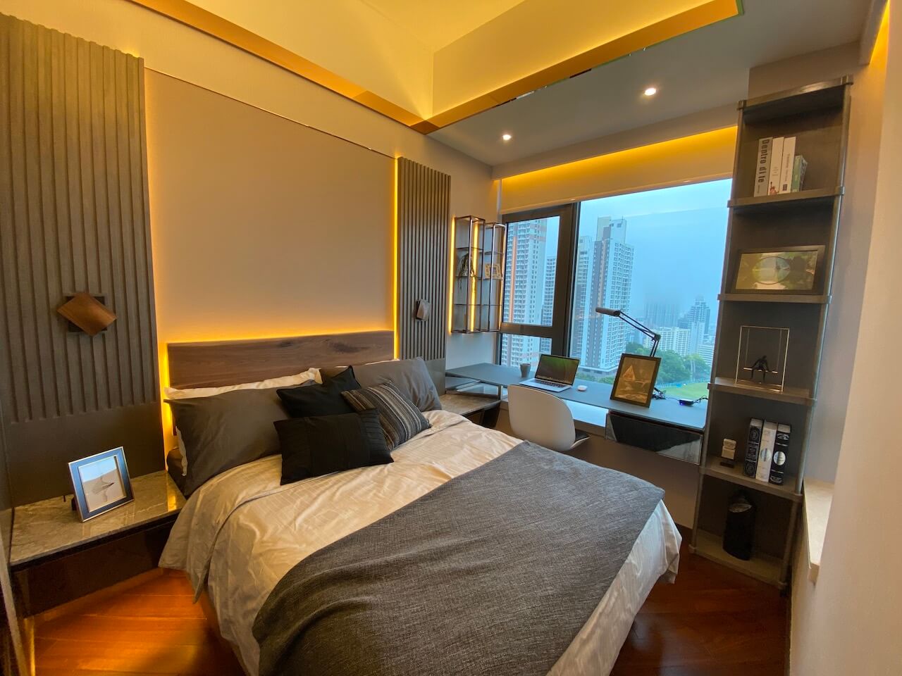 This case uses a calm dark wood color as the main theme. There are multiple dark brown mirrored walls in the living and dining room, which greatly increases the sense of space. With different shades of marble walls and floors, it creates a gradual effect to bring out lifestyle. The designer uses different materials such as mirrors, light and space intervals to match the interior design of the dark wood color to maintain a balance between enhancing the sense of space, and creating elegant and large homes through texture. The shelves, dining tables and ceilings of the living and dining rooms are also designed with wood grain, and the dark living room furnishings are complemented by the colors and the entire atmosphere, making it feel relaxed and elegant. The living room is also equipped with a large wine cabinet and B&O audio equipment, turning the entire living room into a small club. The design of the master bedroom and the dining room are closely linked. It can be seen that the floor and walls are replaced with a dark wood grain design, while the dressing table and bedside table are designed to complement each other with wood grain tones similar to the floor.