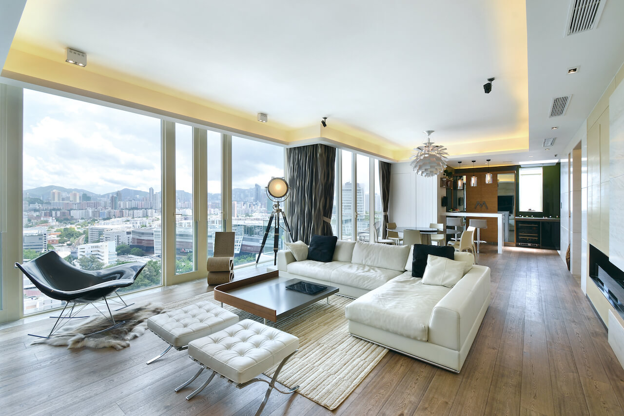 屋主期望居所巨有寬裕空間感,客廳以自然大地色系為主,塑造視覺上的輕型無壓感,再以清玻璃及砂鋼飾面與主色調形成強烈對比。居高臨下的單位條件配以簡單多面落地大玻璃及扇天窗,除了將區內景致一覽無遺更可輕易引入自然光。