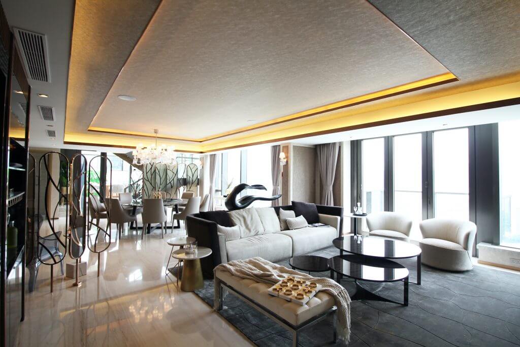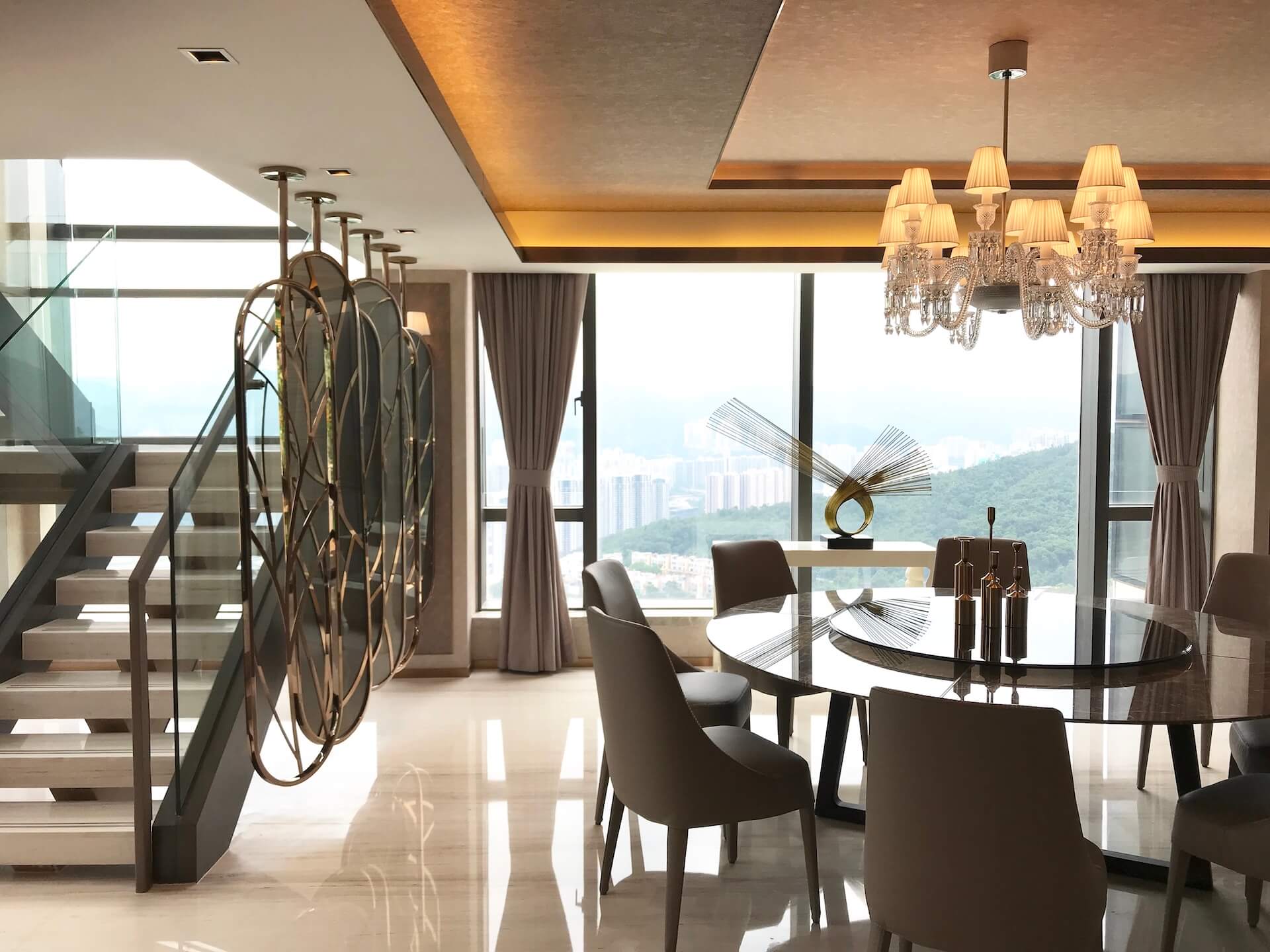寬敞的空間與優雅的風格是理想搭配,白金沙石地台在陽光照射下隱約閃爍著星點亮光,玄關旁一幅啡金沙雲石牆以及一對Baccarat壁燈,配合飯廳的水晶吊燈散發優雅貴氣。