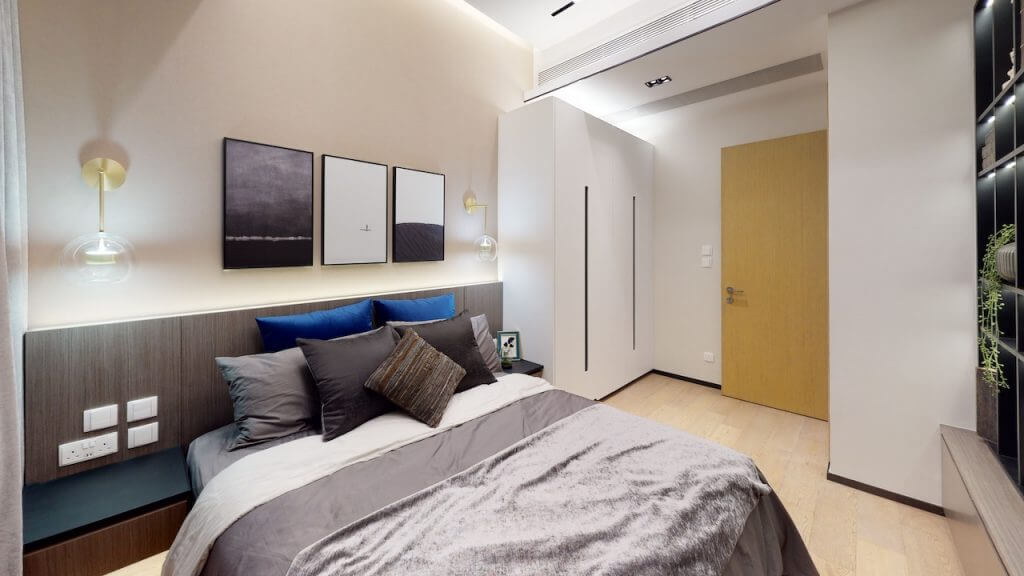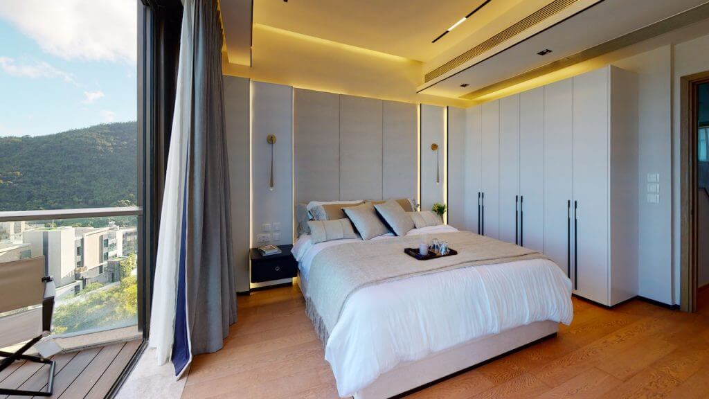 主人臥室的櫃門與地板採用了磨砂面焗漆及不同的木紋互相映襯,低調而充滿質感。