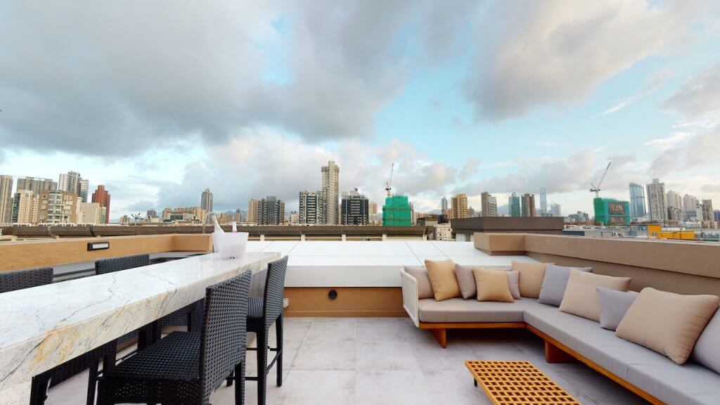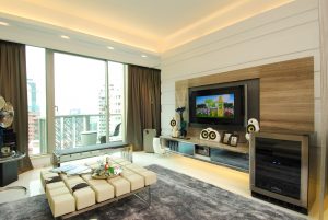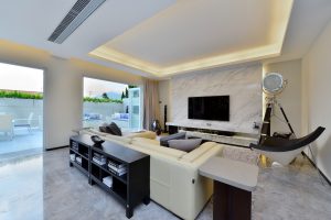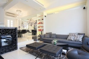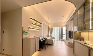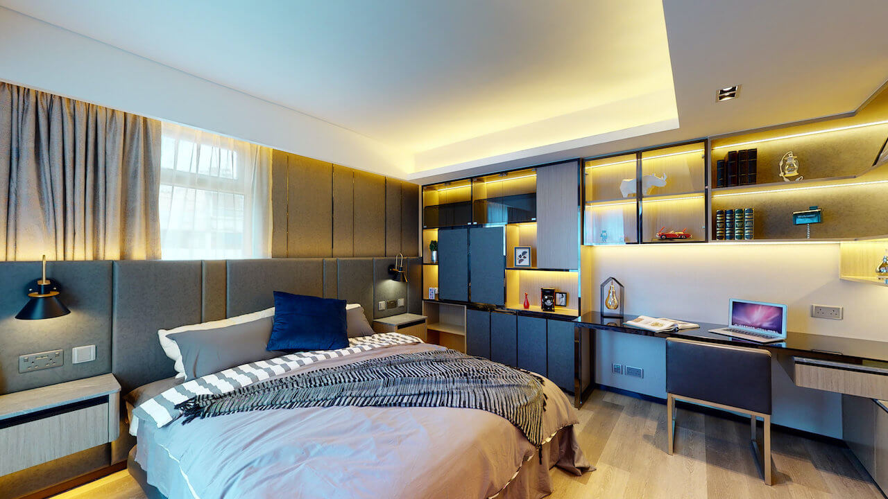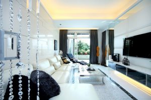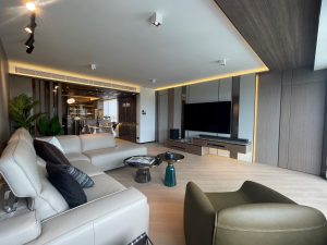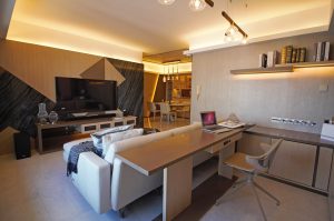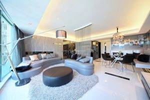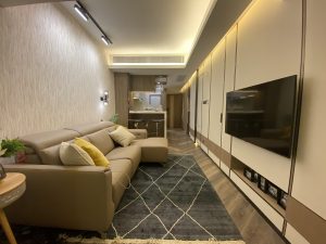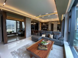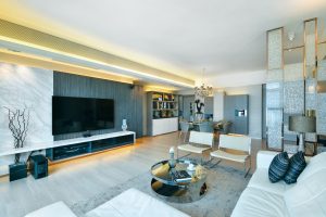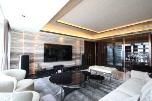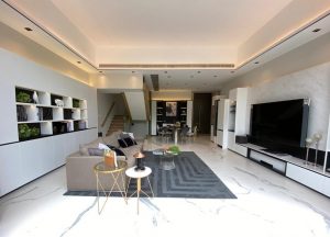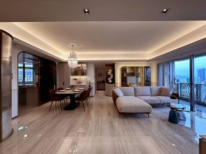 室內色調均以淺灰白色及大理石搭配為主,包括地板、茶几,浴室牆壁,都可見得到大理石元素的蹤影。它獨一無二的天然紋理以及光滑堅固的質感是它魅力的所在,亦是讓整個設計升華很重要的一環。