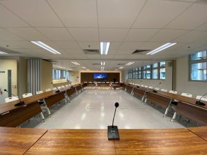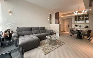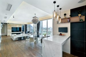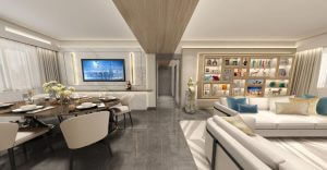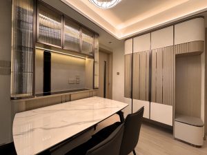 半開放式廚房採用了淺灰色的大理石吧檯面映襯整個單位灰色元素的設計,吧檯的設計為家人提供多一個休憩凝聚的地方,增加了廚房的實用性及家人之間的互動。飯廳放置長型飯枱配上水晶吊燈,盡顯氣派奢華。