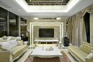從一進大門的玄關特色牆到客廳電視特色牆、牆身層架以至天花,多個位置均以金鋼條貫穿。金色鋼條設計讓人感覺高貴,不但體現戶主的奢華品味,更讓傢俱獨具一格,讓室內充滿優雅和古典氣息。