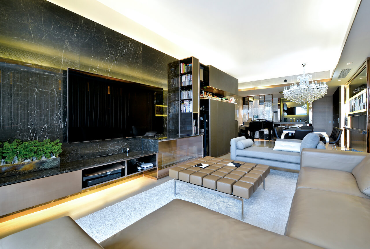 單位佈置饒富特色,以玫瑰金鋼框配3D亞加力膠製成的屏風,若隱若現,分隔廚房與飯廳,卻無阻光源進入廚房,閃爍華麗,與廳區內的回憶牆爭奪焦點。