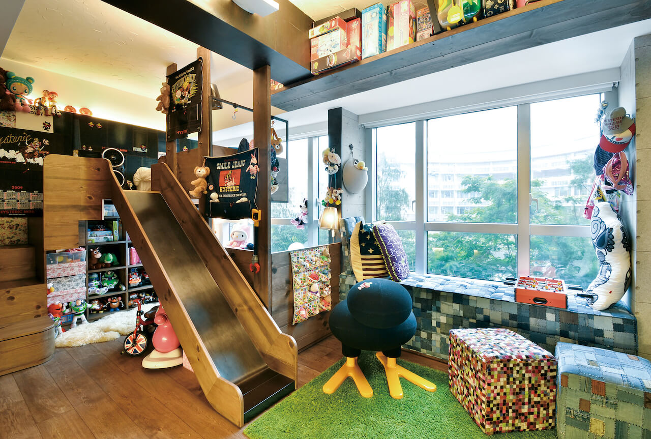 孩子勇於接受新事物,一般的公主床未能滿足她們的需要,ERIC設置上下格睡房毗連玩樂滑梯,連同訪邊的抽屜梯級,姐妹游走于這組玩味睡床,樂在其中。