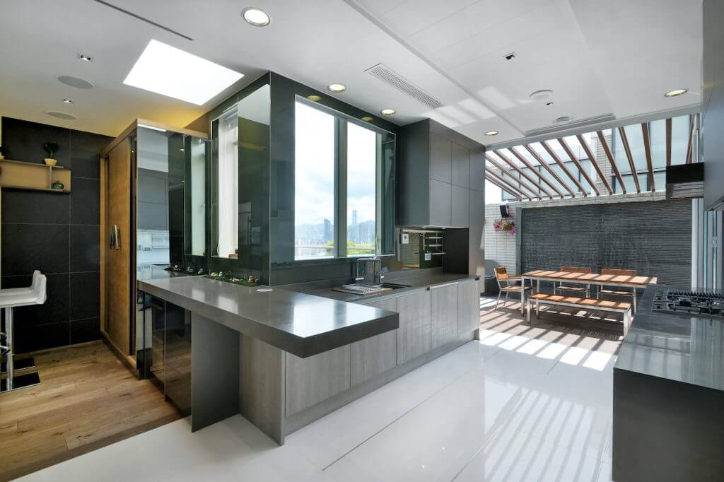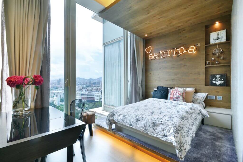 厨房亦利用玻璃引入充沛光线,当趟开玻璃门达致里外连贯,扩阔空间。作开放式规划的厨房极具空间感,工作台面以黑色人造石焗漆的全高柜搭配哑色木饰面地柜,效果稍作变化。房间突显独特个性,女儿房以木色作主导,床头墙以松木饰面更延伸至天花加入霓虹灯点缀。