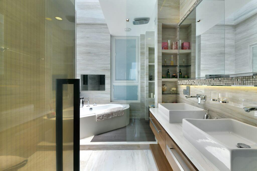 屋主期望居所巨有寬裕空間感,客廳以自然大地色系為主,塑造視覺上的輕型無壓感,再以清玻璃及砂鋼飾面與主色調形成強烈對比。居高臨下的單位條件配以簡單多面落地大玻璃及扇天窗,除了將區內景致一覽無遺更可輕易引入自然光。
