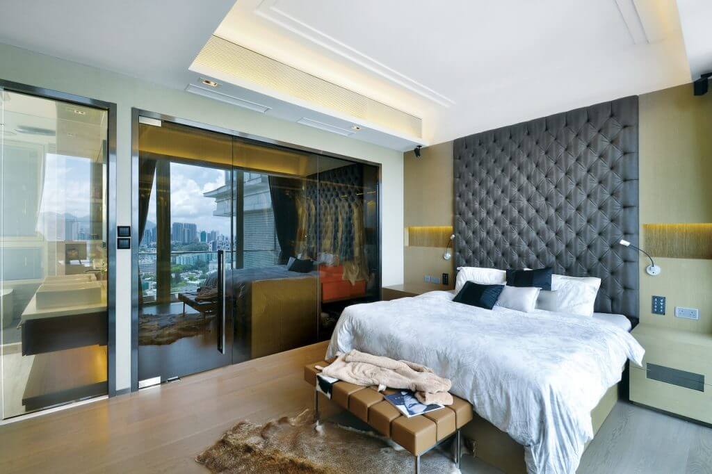 廚房亦利用玻璃引入充沛光線,當趟開玻璃門達致裡外連貫,擴闊空間。作開放式規劃的廚房極具空間感,工作檯面以黑色人造石焗漆的全高櫃搭配啞色木飾面地櫃,效果稍作變化。房間突顯獨特個性,女兒房以木色作主導,床頭牆以松木飾面更延伸至天花加入霓虹燈點綴。