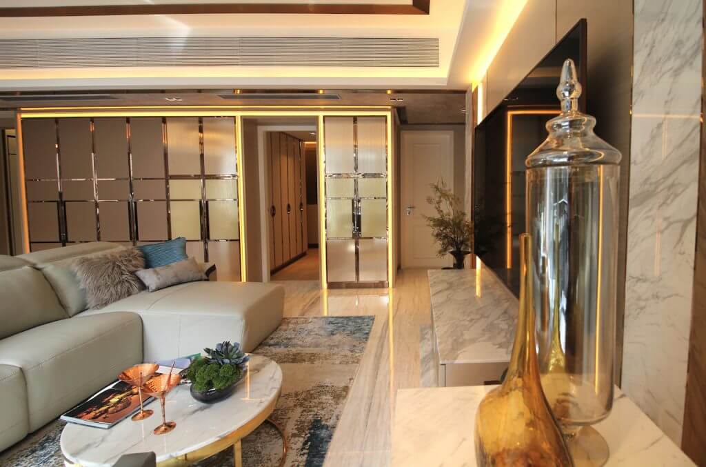 一进大门一幅立体云石特色墙映入眼帘,四边的渗光效光犹如云石画框,营造出既沉稳又高贵的格调。整间屋配搭了各种不同的物料,包括云石、金属、木材和皮等,塑造出高贵的感觉。客厅的空间布局亦呈现干净俐落的线条,由吧台位置,到饭台再到茶几,由高至低丰富了整体的层次感。客厅左侧的鞋柜门运用了钢材,配合同色系的扪皮及木饰面,让豪华与摩登同时并列。