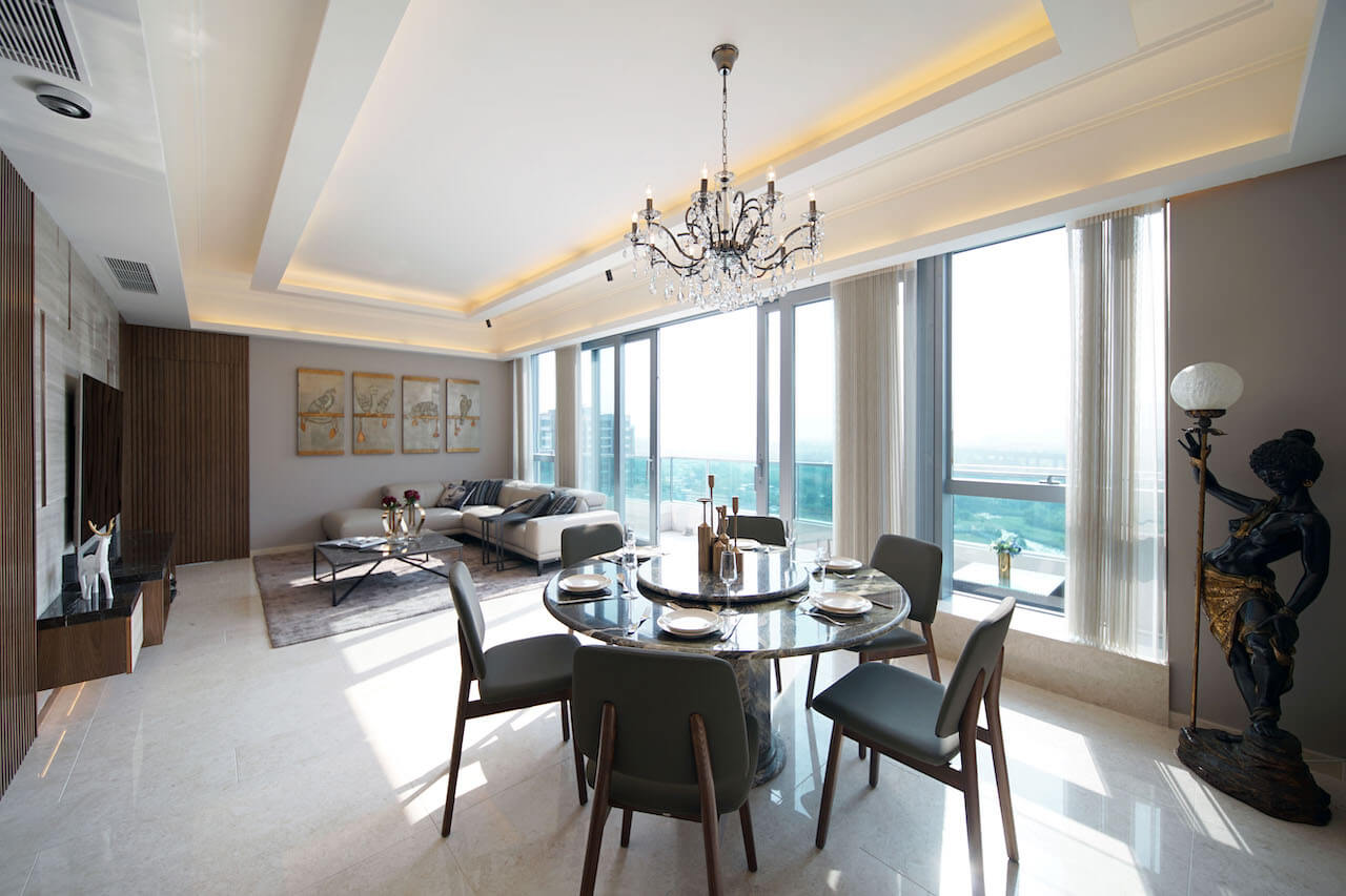 整屋以大地色为主调,铺陈胡桃木条子作装饰特色,注入呼应户外大自然之元素,也同时塑上稳重高雅的品味,好配衬出户主收藏摆设如陈年醇酒般的深厚意趣。主人睡房墙壁以棕色扪皮布置,其中床头背墙以深棕色扪皮居中,以金色边框修饰两侧,而两旁各以浅棕色扪皮烘托,再挂两盏壁灯,恍如酒店般的气派。单位设有天台,天台地台铺户外木,除了置有户外梳化与餐台椅外,
